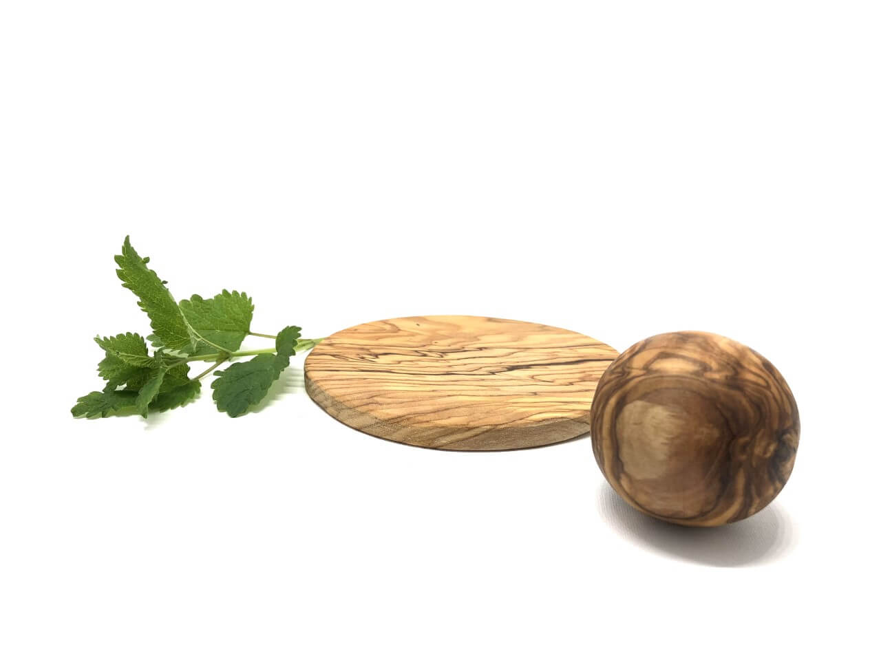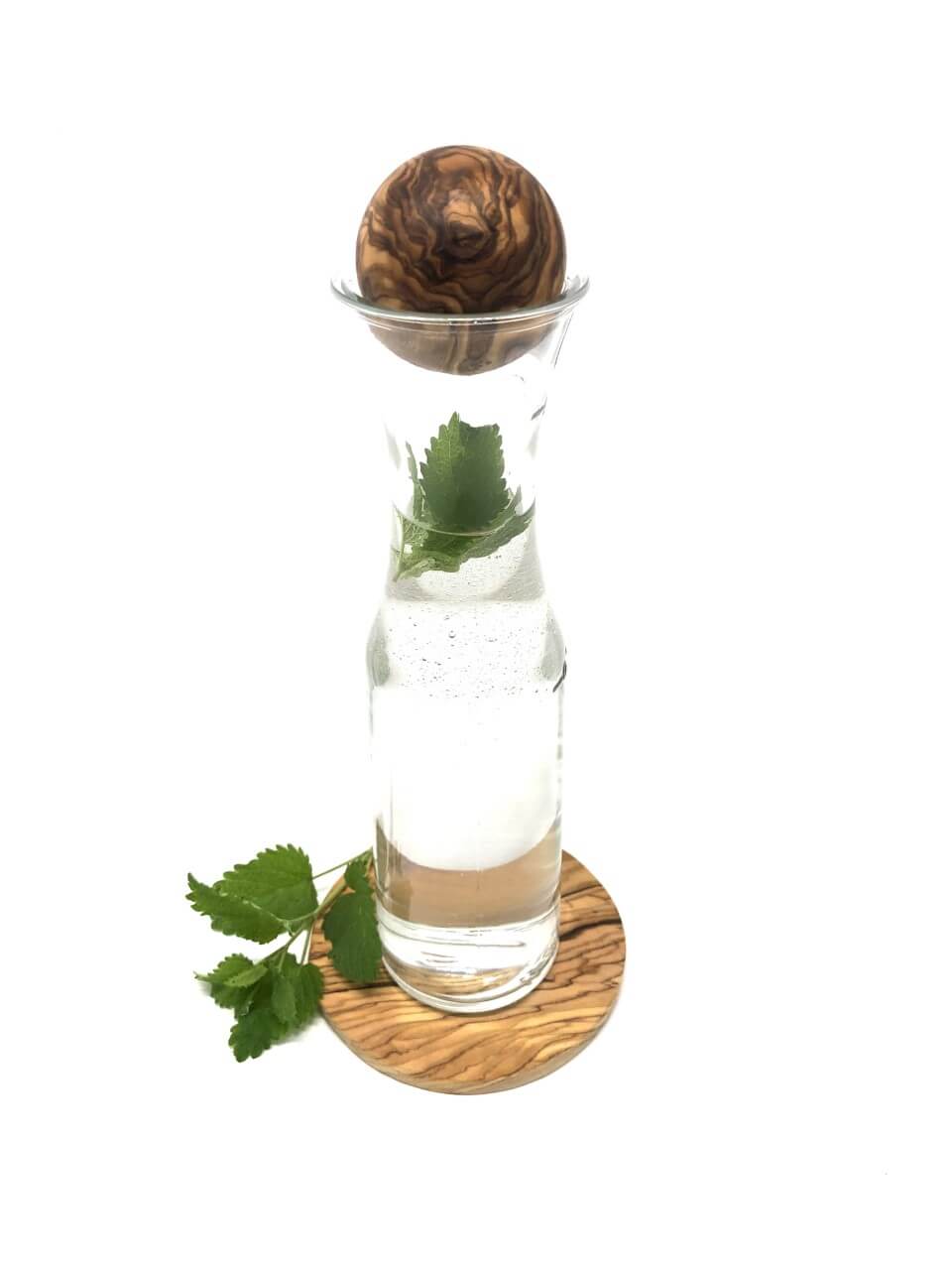 Kugelverschluss für Karaffen aus Olivenholz mit Untersetzer